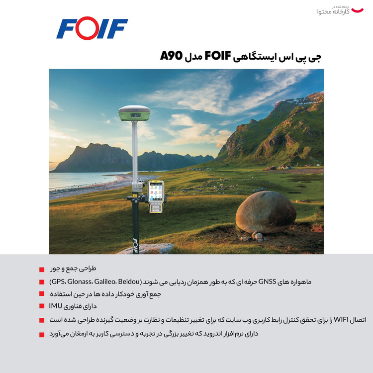 نسل جدید جی پی اس مولتی فرکانس فویف A90 با دریافت 800 کانال فول GNSS از تمامی سیستم های تعیین موقعیت، جدیدترین گیرنده کارخانه FOIF با تکنولوژی روز میباشد.قابلیت دریافت امواج حامل و سیگنالهای باند L1 , L2 , L2C , L5 , L-band از سیستم تعیین موقعیت جی پی اس را درا میباشد. قابلیت دریافت و پردازش تصحیحات E5B ,E5A از ماهواره های گالیلئو و همچنین دریافت سیگنال از تمامی فرکانسهای سیستم تعین موقعیت QZSS. این گیرنده قابلبت ردیابی امواج WAAS , MSAS , CAGAN , ECNOSS , GAGAN,MSA از سیستم SBAS را نیز دارا میباشد.