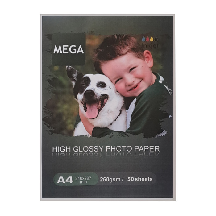فتو گلاسه ۲۶۰ گرم A۴ مگا - مخصوص چاپ عکس رنگی و سیاه سفید - یکرو - پشت مارک دار - کاملا سفید خالص وبسیار براق - مختص پرینتر جوهر افشان.