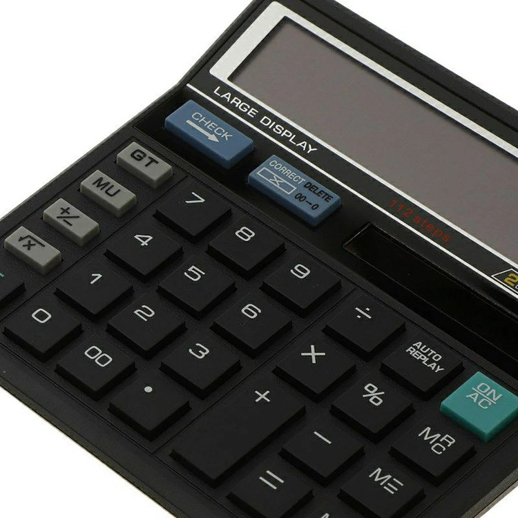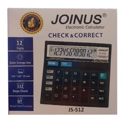 ماشین حساب مدل JOINUS JS-12 برخورداری از کلید دو صفر، کلید های AC، GT، M+ M- MRC، CE و Check، مجهز به دکمه Auto Replay جهت نمایش خودکار مراحل محاسبه تامین انرژی از طریق یک عدد باتری داخلی و پنل خورشیدی تعبیه شده بر روی بدنه ماشین حساب با قابلیت خاموش شدن خودکار بدنه محصول ساخته شده از جنس پلاستیک مقاوم در برابر آسیب های فیزیکی احتمالی همچون ضربه و فشار قابلیت انجام محاسبات درصدی و رادیکالی و اعمال تغییر در محاسبات انجام شده از طریق دکمه Correct نمایشگر از نوع تک خطی و تک رنگ، پشتیبانی از 12 عدد کارکتر و نمایش محاسبات تا 112 مرحله قبل