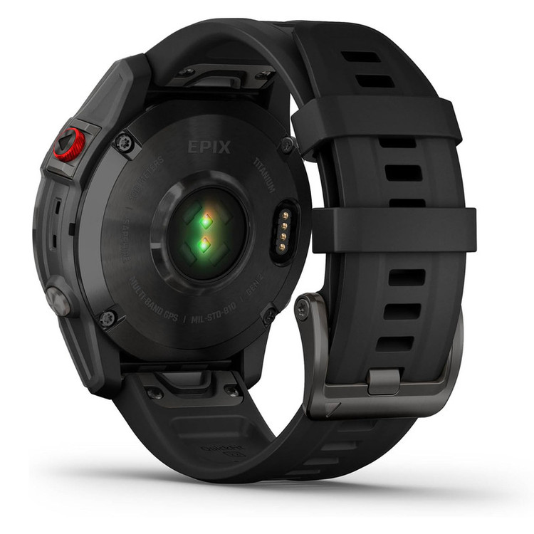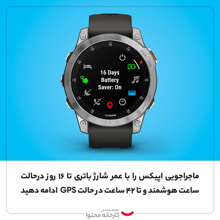 محصول سال 2022 گارمین نسل دوم از ساعت محبوب اپیکس ، یعنی اپیکس 2 یا epix (Gen 2) است . این ساعت با طراحی بسیار زیبا و شیک به بازار معرفی شده . ویژگی منحصر به فرد این ساعت نسبت به سری فنیکس این است که صفحه نمایش لمسی این ساعت از نوع AMOLED بوده و دارای شفافیت و نور زیاد و همچنین تراکم پیکسلی بالاست . ساعت گارمین اپیکس 2 برای اولین بار سه ویژگی صفحه لمسی و نمایشگر آمولد و شیشه سافایر را باهم به صورت همزمان در یک ساعت به بازار معرفی کرده. به این صورت که هر زمان که احتیاج به صفحه نمایش لمسی نداشتید ( مانند شرایط کوهنوردی و شنا ) میتوانید آن را خاموش کرده و از دکمه ها استفاده نمایید . محدودیتی وجود ندارد . رابط کاربری این ساعت نیز بسیار نرم و پرسرعت شده تا با صفحه نمایش لمسی راحت تر کار کنید . مشکی ( با پارت نامبر 010-02582-11) بدنه این مدل از ساعت اپیکس 2 از جنس تیتانیوم با پوشش ضد خش DLC به رنگ مشکی است . همچنین یک عدد بند مشکی ضد حساسیت 22 میلیمتری (از نوع Quickfit ) روی این ساعت وجود دارد . سفید ( با پارت نامبر 010-02582-21) بدنه این مدل از ساعت اپیکس 2 از جنس تیتانیوم با پوشش ضد خش DLC به رنگ سفید است . همچنین یک عدد بند مشکی ضد حساسیت 22 میلیمتری (از نوع Quickfit ) روی این ساعت وجود دارد . باطری این ساعت از نوع شارژی لیتیومی است و عمر آن در صورتی که در حالت اسمارت واچ باشد 16 روز است که برای ساعتی با صفحه نمایش AMOLED بسیار عالیست. درصورتی که در حالت always-on باشد عمر باطری به 6 روز میرسد . اگر تنظیمات ذخیره باتری را روشن کنید تا 21 روز میتوانید از ساعت استفاده کنید . تا 42 ساعت میتوانید GPS استفاده کنید .ساعت اپیکس 2 هم مانند فنیکس 7 دارای تمام سنسور هاست.جی پی اس GPS ، گلوناس وگالیله و MULTI-FREQUENCY POSITIONING -GLONASS -GALILEO