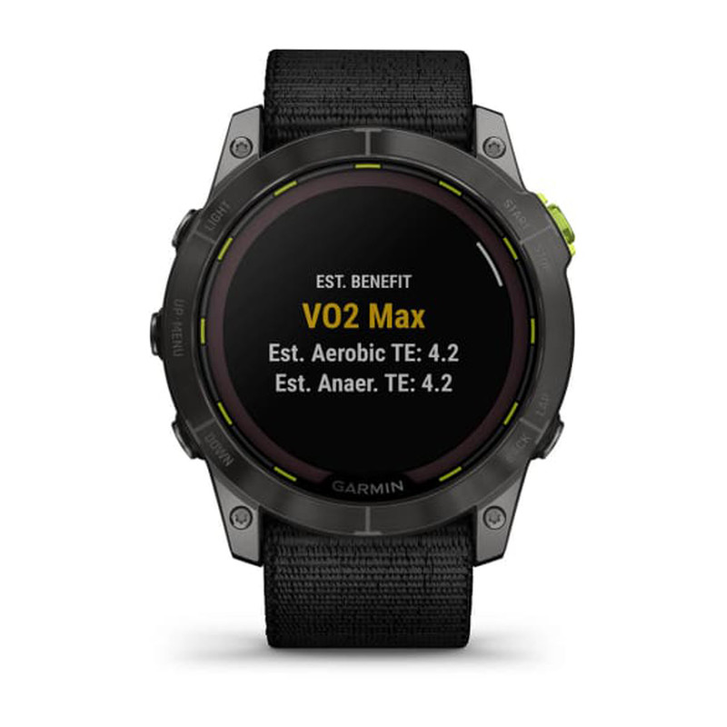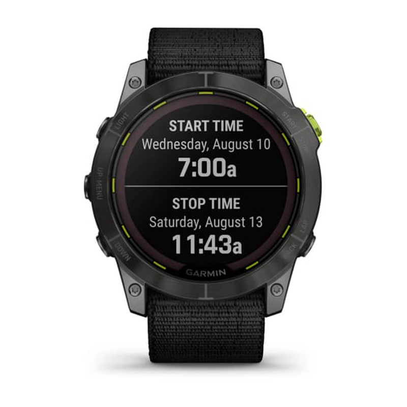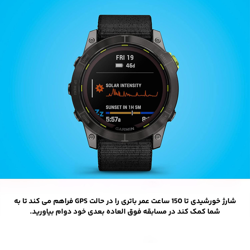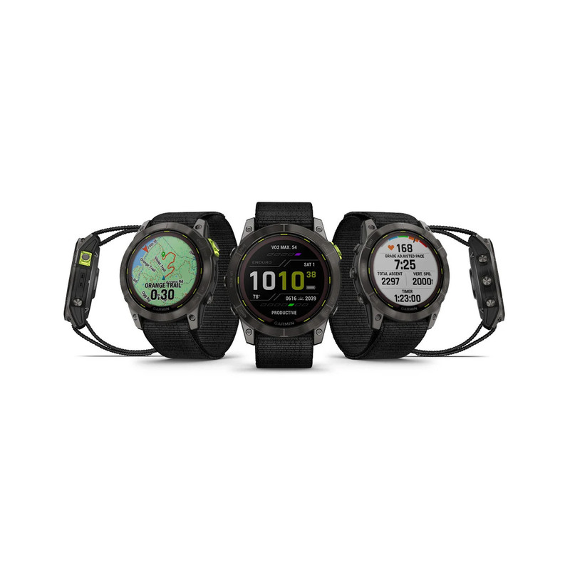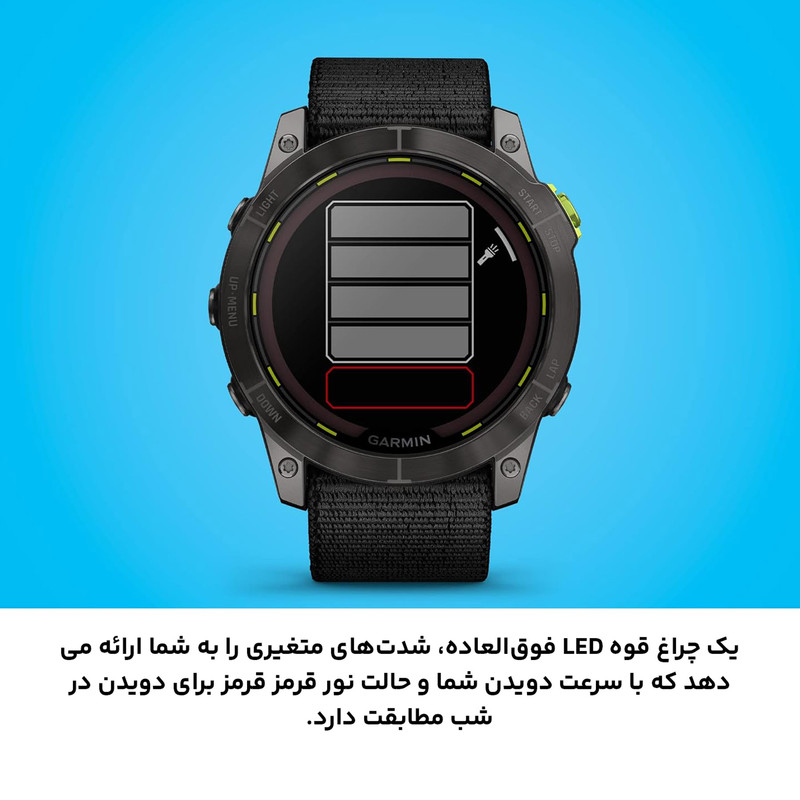 ساعت گارمین اندیورو 2 – Garmin Enduro 2 sport watch محصول آگوست 2022 است . یک ساعت مالتی اسپرت با وزن سبک و قابلیت های استثنایی . این ساعت دومین مدل از سری ساعت های محبوب endure گارمین است . خصوصیت بارز این مدل وزن بسیار سبک و البته باطری بسیار قوی این ساعت است . دور بدنه این ساعت از جنس تیتانیوم است . این ساعت دارای صفحه نمایش پاورسافایر Power Sapphire لمسی TochScreen و دارای شارژ خورشیدی Solar Charging است . ساعت اندیورو 2 همانند ساعت فنیکس 7 ایکس دارای چراغ ال ای دی LED Flashlight دو رنگ (سفید و قرمز) برای استفاده به عنوان چراغ قوه و همچنین چراغ هشدار است . صفحه نمایش این ساعت بزرگتر شده و سایز آن 1.4 اینچ میباشد. به همراه این ساعت یک عدد بند نایلونی چسبی 26 میلیمتری به نام Sport loop که بسیارسبک و نرم است وجود دارد . این بند مناسب ورزشکارانی ست که به ساعت سبک احتیاج دارند و همچنین بسیار راحت و سریع باز و بسته میشود . ساعت گارمین اندیورو 2 دارای یک عدد بند سیلیکونی 26 به رنگ مشکی هم هست . باطری این ساعت در حالت Smartwatch تا 34 روز و با شارژ خورشیدی Solar تا 46 روز روشن میماند . همچنین عمر باطری این ساعت در حالت Power Saving Mode تا 111 روز و با سولار تا 550 روز است . همچنین دارای استاندارد ضد آب و گرد و غبار 10ATM میباشد . ساعت اندیورو2 دارای حافظه 32 گیگابایتی برای ذخیره موزیک و نقشه است .